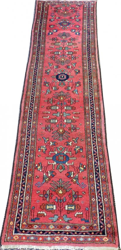 HAMADAN HAND WOVEN RUNNER, C. 1920, W 2' 7" L 10':Having a reddish orange ground, decorated with stylized floral and foliate motif. Measuring L. 10 ft. x 2 ft. 7. Circa 1920.