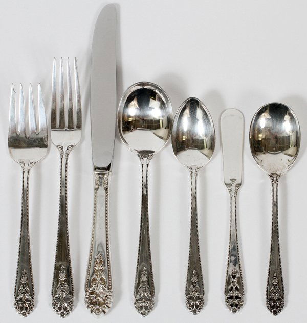 INTERNATIONAL STERLING QUEEN'S LACE FLATWARE 35 PIECES:Queen's lace pattern. Six place forks; six salad forks; six plate knives; six teaspoons; five bread and butter knives; five cream soups. 1 sugar spoon Case is marked Wright Kay & Co.