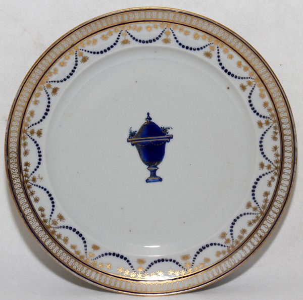 CHINESE EXPORT PORCELAIN PLATE, 18TH C. , DIA 7 3/4":Plate centered by a cobalt blue urn. Gilt border with blue enamel swags. From the Estate of Eunice Bundy, Bloomfield Hills, Mi.