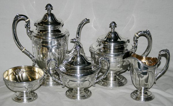 TOWLE LOUIS XIV STERLING COFFEE AND TEA SERVICE, 5 PIECES:Coffee pot 10 1/2", Tea pot 8", Creamer 6", Sugar with lid 6 1/2", waste 3". Monogrammed. Leaf & flower design, finials & ivory accents. 76160 numbered on bottom.