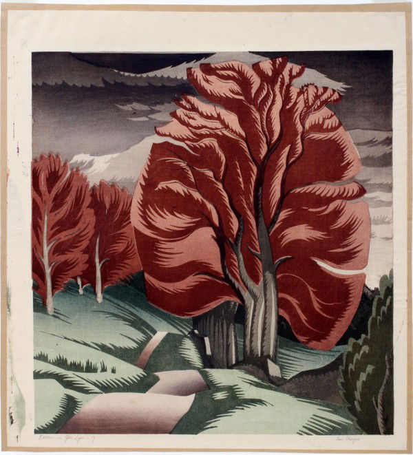 IAN CHEYNE, COLOR WOODCUT, 13" X 12", 1917, "BEECHES IN GLEN LYON": SCOTTISH 1895-1955:Pencil signed and dated; unframed.