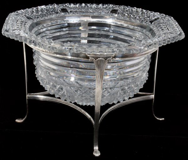 GEORGE III STERLING & GLASS CENTERPIECE, LONDON, 1804-05, H 7", W 11":A round sterling silver stand having four ribbed supports joined by a stretcher, fitted with a round cut glass bowl having an evert octagonal rim with cut diamond pattern. Hallmarks include a lion passant, crowned leopard, king's profile, and date letter "I", with rubbed maker's mark (illegible, see additional photo--two letters "R/S", possibly Robert and Samuel Hennel). Measures H.6 3/4", W.11 1/2".