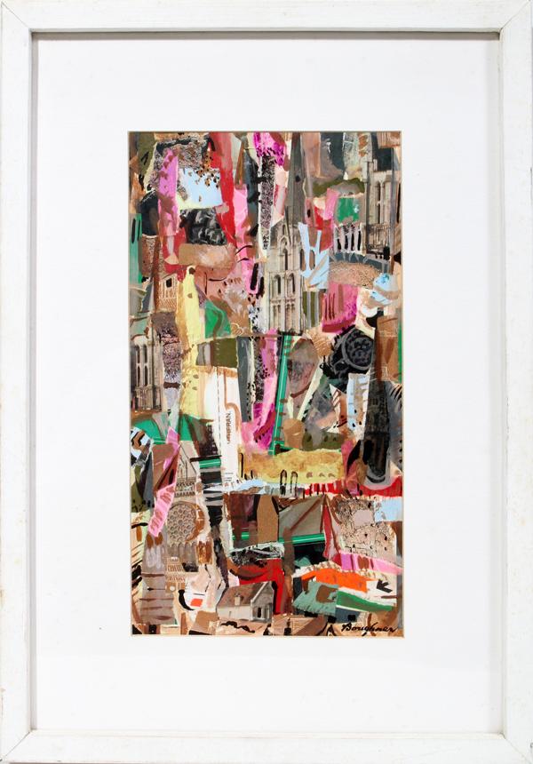 DONALD BOUGHNER, COLLAGE 1987 13" X 7" 'CATHEDRAL':collage depicting different cathedral scenes and architectural features; signed lower right; framed and matted under glass; white painted frame;