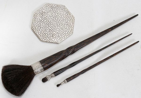 "JOHN HARDY STERLING SILVER & SIMULATED BALEEN COSMETIC BRUSHES, THREE, & A MIRROR:Including 1 powder brush, L. 11 1/2"" overall, and 2 eye shadow brushes, L.7"" and 7 3/4"", each with sterling silver collars stamped ""925 Indonesia"" and simulated baleen handles; together with 1 octagonal sterling silver mirror, W.3 1/4"", also stamped ""925 Indonesia"". Four pieces total, all by John Hardy." (rev.20081114)