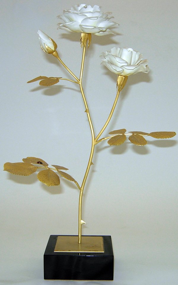 R. VAN RUYCKEVELT BONE CHINA WHITE ROSE ON GOLD METAL, 'MENNECY', H 17", W 10":Made in England.