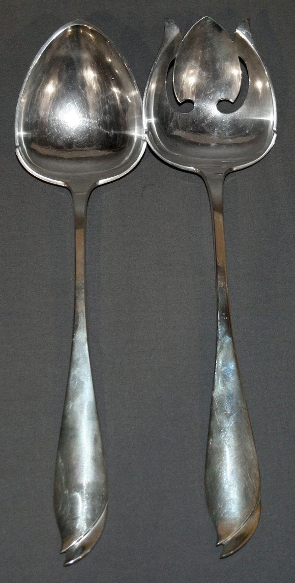 HAND-WROUGHT STERLING SILVER SALAD SERVING SET OF TWO PIECES, MARKED 'CHD', L 10 1/4":Hand-wrought, including 1 fork and 1 spoon, each stamped on the reverse with "CHD, 21 S, Hand Wrought Sterling" [unidentified]. Totaling approximately 7.59 troy oz.