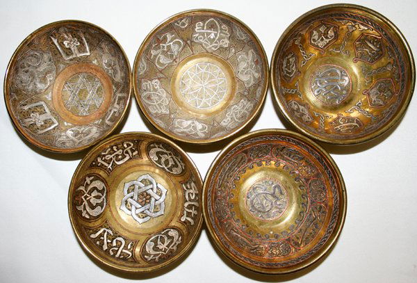 ALGERIAN AND EGYPTIAN BRASS BOWLS C 19 TH C, 5 PCS. , H 2", DIA 5":with copper & silver overlay designs; ex - Matilda Dodge Wilson Estate.