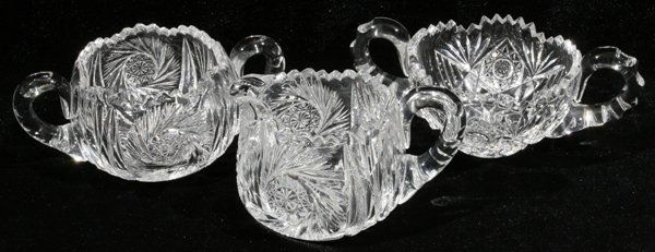 CUT GLASS CREAMER & SUGAR, C. 1900, THREE, H 3":Having pinwheel designs.
