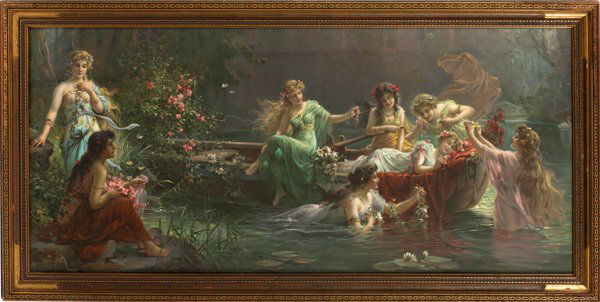 COLOR PRINT WITH EIGHT VIRGINS AND CANOE, H 22" W 44":See the 2nd, Picture and Photo. - - Good condition. - For a high resolution photo
