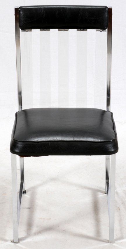 DAYSTROM FURNITURE CO. , STAINLESS STEEL & VINYL CHAIR, H 34":A stainless steel chair with an acrylic slat back, and upholstered black vinyl seat and back. Measures approximately H.34" x 16" x 19 1/2".