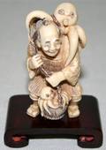 Two Baskets and a Shadow Puppet, southern Asia, a basket bag with a ring handle on one side; a basket cage with a ring hook on top; and a shadow puppet in the shape of a human with dragon head and one moving arm, polychrome paint decoration, ht. to 28 3/4 in.