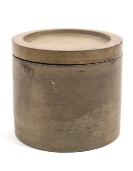 Chinese, 20th century. A cylindrical covered tea caddy with plain, mottled exterior, lid having recessed cavity at center, the interior of box with textured bottom. Marked to underside of lid and body with six character calligraphic mark within a rectangular cartouche. Approximately 4.25" tall x 4.75" diameter.