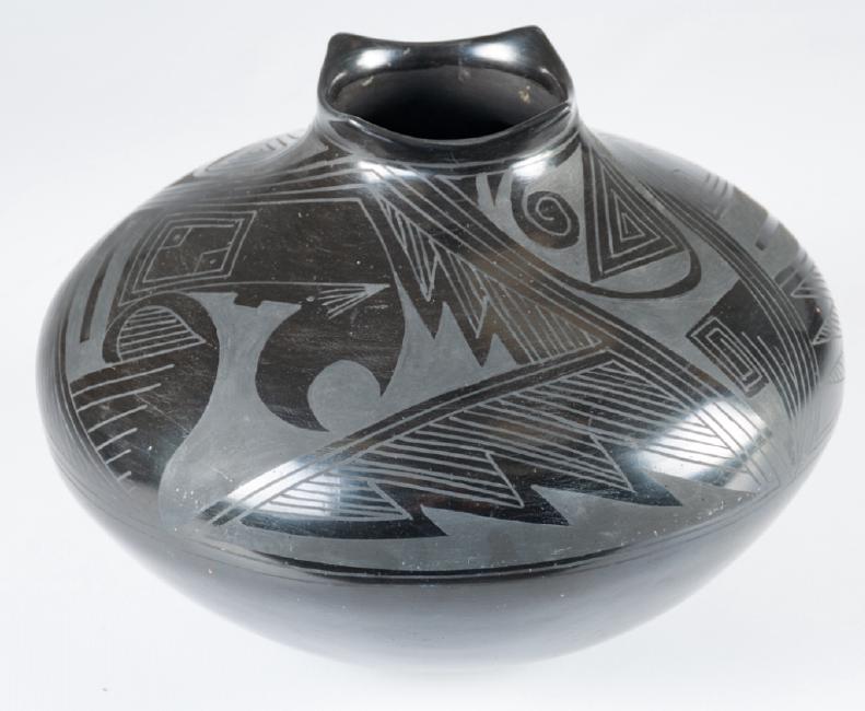 Reynalda Q. De Lopez of the Casas Grandes, Mata Ortiz region, black on black pottery vase; measures approximately 8’ high and 11” in diameter. Signed to the bottom.