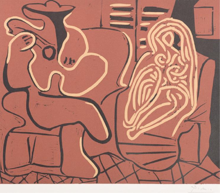 Pablo Picasso (Spain, 1881 - 1973) 1959 linocut signed by the artist to the lower right hand corner. Measures approximately 12-1/2" in height by 14-7/16" in width. No certificate of authenticity accompanies this piece, however style & signature are representative of the artist's known works. Provenance: from the estate of a prominent European & Texas collector, known to not only to have collected quite an amazing assortment of notable art, but to have befriended a vast majority of the artists of whose work was acquired. In overall good condition, all measurements are approximate. Linocuts form a relatively small part of Picasso’s oeuvre as a printmaker, however some of his most outstanding compositions were produced using this method in a short burst of activity between 1958 and 1963. It is our recommendation that all pieces must be examined in person by perspective clients or a dealer they have asked to give them a condition report. This is consistent with our terms of sale that all goods are sold as is and all sales are final.