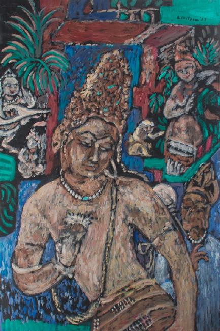 Evelyn Metzger (American, 1911-2007) oil on panel; signed to upper right and dated '97; possibly depicting a copy of an Ajanta & Ellora Caves painting in the Aurangabad district of Maharashtra of India . An autobiographical book that accompanies the painting is "The Age of Grandeur And A Woman Who Lived It: Artist Evelyn Metzger". It is a hard bound book that covers both her social life and her artistic appreciation and contributions, examining her formal studies of art history at Vassar, her flexibility and travels, and her portraits. Artwork measures approximately 36" in height by 24" in width unframed and the book measures approximately 11-15/16" x 9-1/2"; painting in good overall condition and book in very good condition. For further information about this artist, please refer to lot #7 in this catalog.