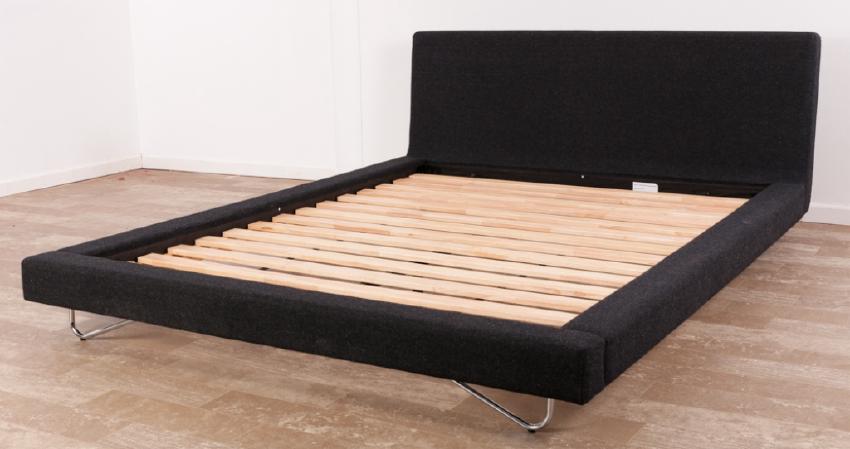 Designed for CB2 of Chicago Illinois, Queen platform bed having 20% wool / 80% acrylic fabric with polyurethane cushioning, engineered wood and polished chrome legs; measures approximately 32" high, 60-1/2" wide (inside rail to inside rail), 69-1/2" wide (outside rail to outside rail) and 92" long. Marked with paper label to headboard.