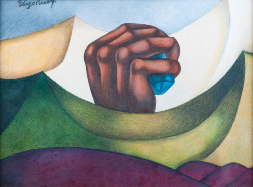 Diego Rivera (Mexico, 1886-1957) colored pencil drawing, framed under plexiglass, and signed upper left "Diego Rivera". Titled "Estudio", and was created as a drawing for the north wall of Rivera's Detroit Industry series "Man and Machine" at the Detroit Museum of Fine Arts. Comes complete with certificate of authenticity, please see photographs. Has framed height of 20", with width of 24", and a sight image height of 11-1/2" with width of 15-1/2". In overall good condition, all measurements are approximate. Provenance: from the estate of a South Carolina collector, who wishes to remain anonymous. It is our recommendation that all pieces must be examined in person by perspective clients or a dealer they have asked to give them a condition report. This is consistent with our terms of sale that all goods are sold as is and all sales are final. For more information about this artist, please refer to lot #75 in this catalog.