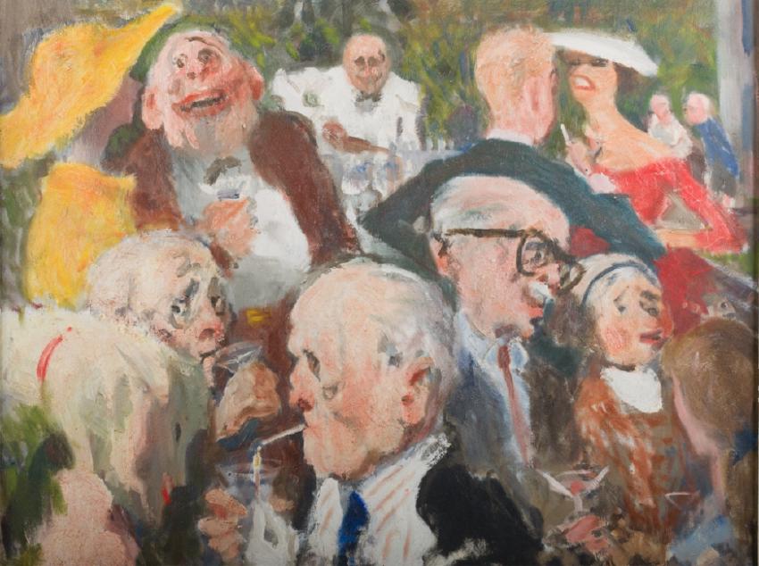 Mid-20th Century Expressionist oil on Masonite of a 1950’s cocktail party, unsigned, possibly a by Washington, DC. artist. Framed; measures 23-1/8" in height by 29" in width with the Masonite measuring 18" in height by 24" in width. All measurements are approximate. Note: this piece has no signature, but this auction house has been alerted to the possibility of this being an original William Gropper work.