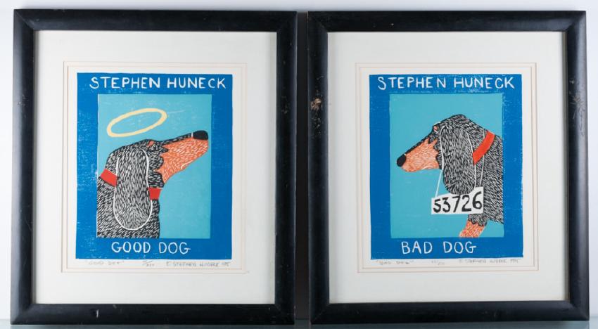 Stephen Huneck (American, 1948-2010) pair of woodcuts titled "Good Dog" and "Bad Dog", identically framed and double matted under glass. "Good Dog" is hand titled, numbered 44/250, signed "Stephen Huneck" and dated 1995 beneath the image. "Bad Dog" is hand tilted, numbered 27/250, signed "Stephen Huneck" and dated 1995 beneath the image. Black painted wooden frames measure 20-1/2" in height by 18-1/8" in width with the sight images measuring 14" in height by 12" in width. All measurements are approximate. In overall good condition. Stephen Huneck (American, 1948-2010) was an American wood carving artist, furniture maker, painter, and author. Most of his artwork is composed of carvings of dogs. In addition to carvings, Huneck also wrote several children's books, the main character of which was his black Labrador Retriever, Sally.