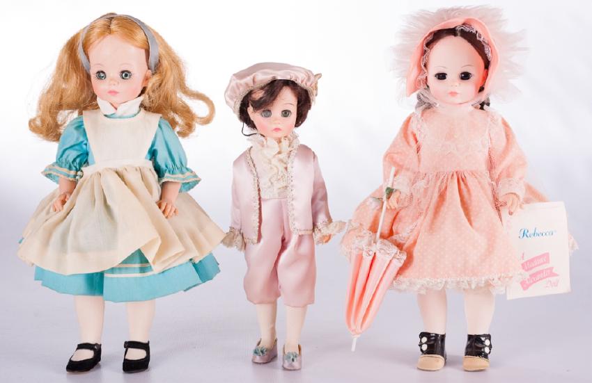 Collection of three (3) vintage Madame Alexander dolls in original boxes. Includes "Rebecca" #1585 measuring approximately 13" in height or a 'size' 14 in Madame Alexander doll sizes, "Blue Boy" #1840 measuring approximately 11" in height, & "Alice in Wonderland" #1552 measuring approximately 13" in height (size 14).