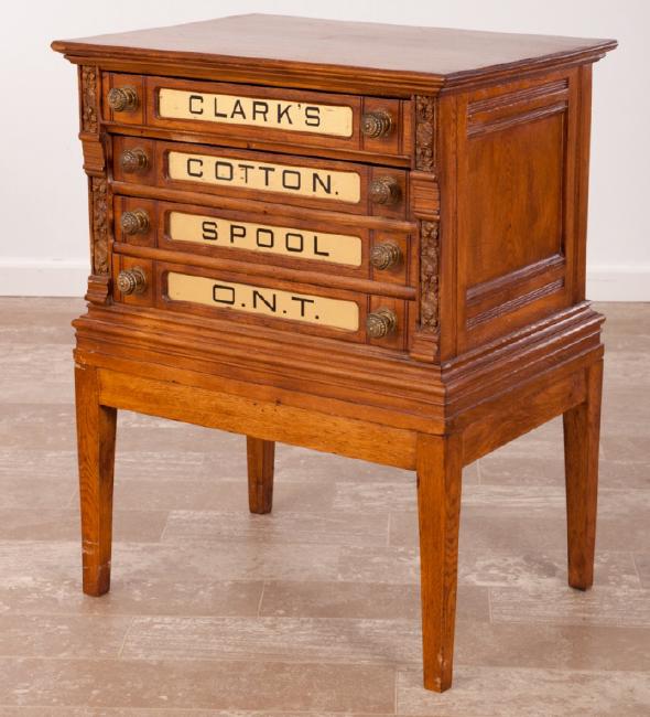Clark’s four drawer spool cabinet of mixed woods having black lettering with gilt front panels marked “Clark’s,” “Cotton,” “Spool” and “ONT” (Our Newest Threads), and with floral and foliate brass knobs to each side all resting on square tapered legs; measures approximately 29-3/4” high, 16-1/2” wide and 22-7/8” in depth.