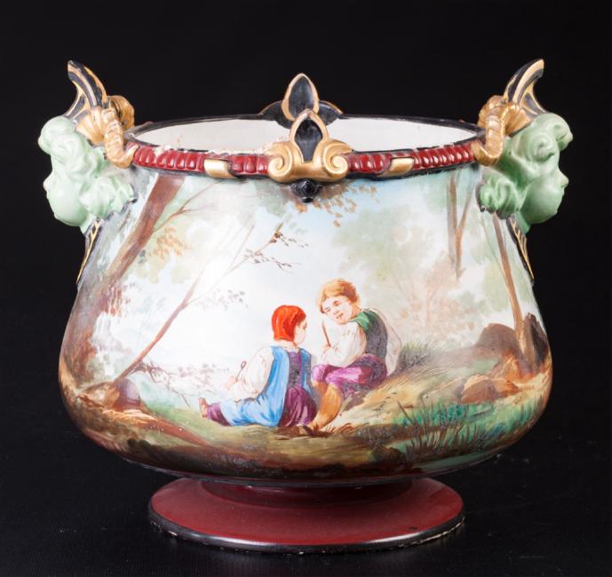 19th Century Continental German or Italian hand painted cachepot; measures approximately 9” high and 9-1/2” in diameter. With repairs.
