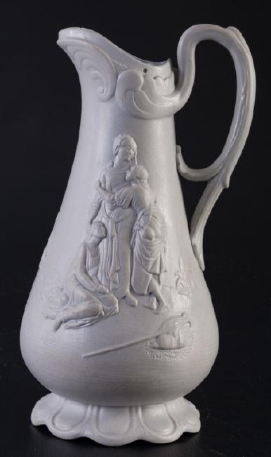 Mid-19th Century salt glazed stoneware pitcher with an English registry mark of November 27, 1847, in the pattern of “Naomi and Her Daughters-in-Law”. Missing pewter lid and with tiny chips to rim; measures approximately 10-1/4” high.