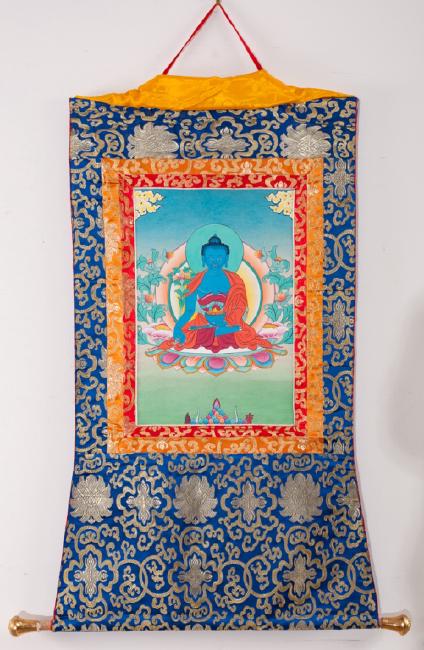 Blue silk wall hanging depicting an East Asian Buddha in Lotus position with a yellow silk cover. Wall hanging measures 37” in height by 22-1/2” in width with a brass capped wooden scroll bar on the bottom of the hanging measuring 28-1/2” in width. The sight image measures 16-1/2” in height by 11” in width. All measurements are approximate.