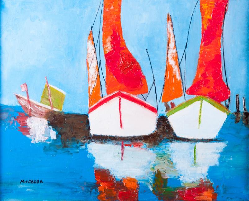 Dominick Mirabella (American, B. 1951) framed oil on canvas painting titled "Dockside" depicting ships in a harbor. Signed "Mirabella" to the lower left hand side of the image. Open face wooden frame measures in 18-1/2" in height by 22-1/4" in width with the sight image measuring 15-1/2" in height by 19-1/2" in width. All measurements are approximate. This piece comes with a Certificate of Authenticity provided by the artist. For more information sbout this artist, please refer to lot #223 in this catalog. It is our recommendation that all pieces be examined in person either by perspective clients or a dealer the client has asked to give them a condition report. This is consistent with our terms of sale that all goods are sold as is and all sales are final.