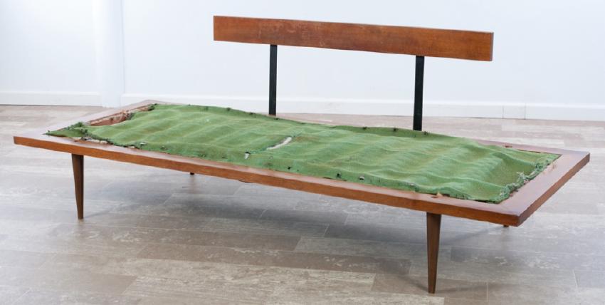 Vintage daybed sofa in the style of George Nelson having a wood frame, horizontal wood backrest and round tapered legs; measures approximately 26-1/4” high, 74-1/8” wide and 31” in depth.