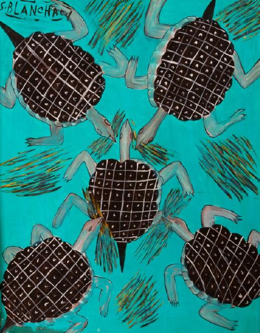 Sisson Blanchard (Haitian, 1929-1981) Oil on board painting depicting five sea turtles in an open face wooden frame. Signed “S. Blanchard” to the upper left hand corner. Frame measures 22” in height by 18” in width with the sight image measuring 19” in height by 15” in width. All measurementsare approximate.Sisson Blanchard (Haitian, 1929-1981) was born in the southern Haitian village of Trouin. Migrating to Port-au-Prince, Blanchard found work as a gardener at the Centre d'Art. He began painting in 1948, with the encouragment of the American sculptor Jason Seley. Blanchard's paintings of birds and farming scenes were first shown at the Centre d'Art, and have since been exhibited all over the world. His work is included in the collections of both the Davenport Museum of Art and the Waterloo Museum of Art, in Iowa.