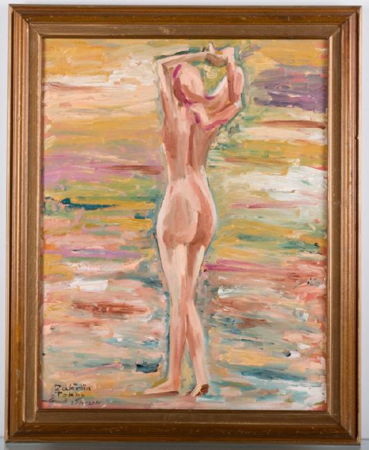 Framed oil on canvas depicting an Impressionist style standing nude female figure from behind in light pastel tones. Signed "Zakriia Tukhi" and dated "3/14/14" to lower left. Open face frame measures 21" in height by 17" in width with the sight image measuring 17-1/2" in height by 13-1/2" in width. All measurements are approximate.