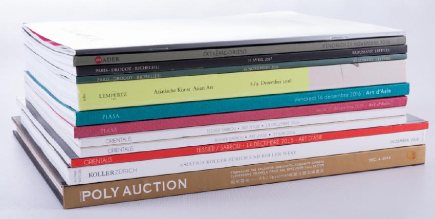 Twelve auction catalogs to include: Ader Nordmann “Extreme- Orient” for November 25, 2016. Beaussant Lefèvre “Art d’Asie” for November 16, 2016 and “Art d’Asie” for April 19, 2017. Beijing Poly Auction “Eternalize the Splendor Ambilight – Exquisite Chinese Cloissonne Enamels from A&J Speelman Collection” for December 4, 2014. Koller Zurich “Asiatica Koller Zurich Und Koller West” for December 7 & 8, 2016. Lempertz “Indische Klienbronzen Sammlung Gunter Heil, Teil I” for December 9, 2016 and “Asiatische Kunst Asian Art” for December 8 & 9, 2016. Piasa “Art d’ Asie” for December 17, 2015 and “Art d’Asie” for December 16, 2016. Tessier Sarrou “Art d’Asie” for December 14, 2015, “Art d’Asie” for June 27, 2016 and “Art d’Asie” for December 19, 2016.