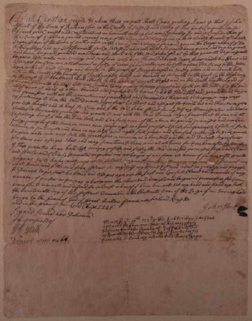 Land deed written and signed by John Flint, declaring a transfer of 10 acres in Suffolk County, New York to an illegibly named person for the sum of 18 pounds in the year 1726. Framed and matted under glass. Wooden frame measures 22" in height by 18" in width with the sight image measuring 19-1/2" in height by 16-1/4" in width. All measurements are approximate. In overall good condition consistent with age.