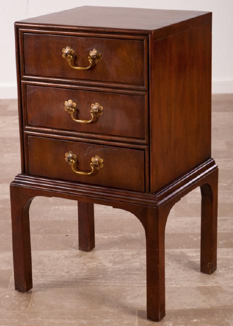 Kittinger Buffalo mahogany three drawer stand having dovetail constructed drawers and resting on tall legs, measures approximately 29” high, 17-1/4” wide and 14” in depth. Marked Kittinger Buffalo to inside bottom drawer with paper label to underside of top drawer “Pattern No. B1815 Serial No. 18G Kittinger Buffalo”.