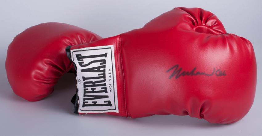 Pair of gloves, one signed "Muhammad Ali" complete with certificate of authenticity from James Spence Authentication (JSA). In acrylic display case, measuring approximately 9" high and 12-1/2" wide and 10" in depth.