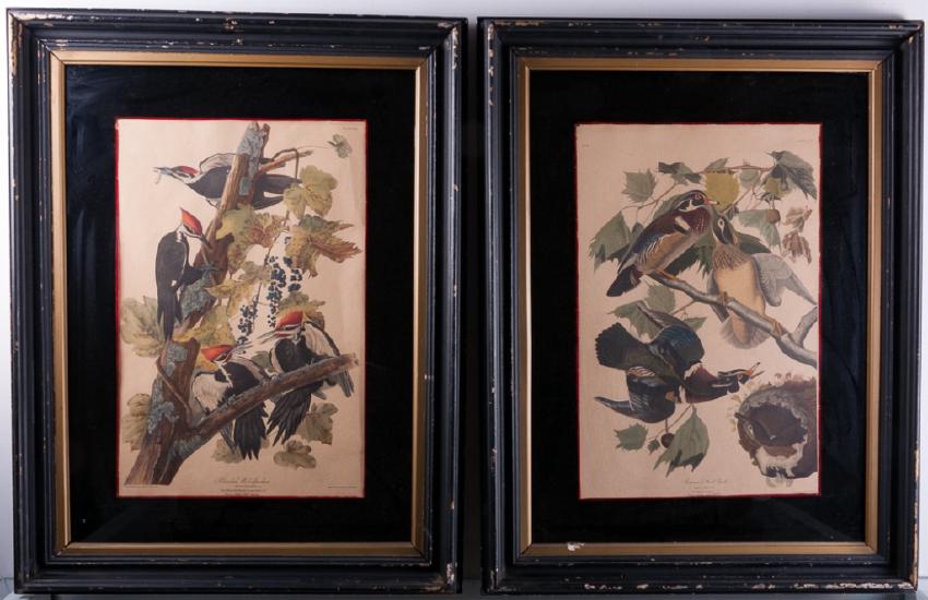 John Audubon (American, 1785-1851) ornithological prints pair. The first being "Summer or Wood Duck" marked to the top left "No. 42", marked to the top right " PLAT CCVI", marked to the lower right "Engraved, Printed, & colored by R. Havell 1834", and marked to the lower left "Drawn From Nature by J. J. Audibon FRS. FLS". The second piece is entitled "Pileated Woodpecker", and is marked to the top left "No. 23", marked to the top right "PLATE CXI", marked to the lower right "Engraved, Printed, & Colored by R. Havell", and marked to the lower left "Drawn From Nature by J.J. Audibon. FRS. FLS". Also marked to lower center "Pileated Woodpecker Picus Pileatus". Both are in identical black frames and matted under glass. Frames measure 28" in height by 21" in width with the sight images measuring 18" in height by 12" in width. All measurements are approximate.