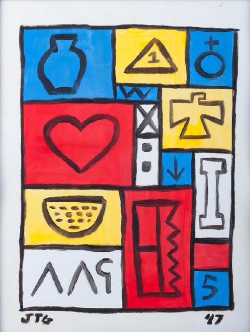 Joaquin Torres Garcia (New York/Spain, France, Uruguay, 1874 - 1949) abstract figural oil on paper, signed to lower left 'JTG" and dated to lower right "47", and framed under glass in dark wood frame. Having framed height of 18", with width of 14-3/4", and sight image height of 13-1/2" with width of 10-1/2". Complete with certificate of authenticity, please see photographs. In overall good condition. Provenance: from the estate of a prominent Southwestern collector.It is our recommendation that all pieces must be examined in person by perspective clients or a dealer they have asked to give them a condition report. This is consistent with our terms of sale that all goods are sold as is and all sales are final.Born in Montevideo, Uruguay, Joaquín Torres-García moved to Spain in 1891. In 1892 he studied at the School of Fine Arts and the Baixas Academy in Barcelona. He had his first individual exhibition in 1900 at the Salón la Vanguardia in Barcelona. In 1903 and 1907 he painted murals for Gaudi's Church of the Sagrada Familia and made stained glass windows for the cathedral of Palma de Mallorca. He painted murals for the Uruguayan Pavilion at the Brussels International Expositions of 1909-1910. In 1920 he went to New York and exhibited with Stuart Davis. He lived in Paris from 1924 to 1932, where he met Mondrian and Van Doesburg and founded the Cercle de Carré with Michel Seuphor. In 1938 he completed the Cosmic Monument in Montevideo's Parque Rodó and published exte