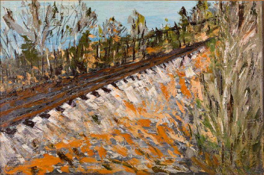 Framed oil on canvas landscape depicting Impressionist style railroad tracks. Signed "Gulam Zakriia Tukhi" and dated "1/1/12" lower left and verso. Open face frame measures 28" in height by 40" in width with the sight image measuring 23-1/4" in height by 35-1/4" in width. All measurements are approximate.