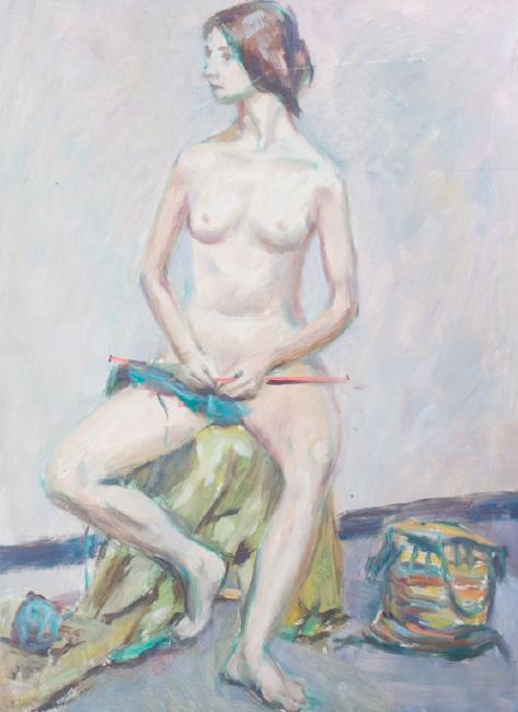 Evelyn Metzger (American, 1911-2007) oil on masonite; unsigned; depicting a nude woman crocheting/ knitting. The book that accompanies the painting is "The Age of Grandeur And A Woman Who Lived It: Artist Evelyn Metzger". It is a hard bound book that covers both her social life and her artistic appreciation and contributions, examining her formal studies of art history at Vassar, her flexibility and travels, and her portraits. Artwork measures approximately 24" in height by 17-3/4" in width unframed and the book measures approximately 11-15/16" x 9-1/2"; painting in good overall condition and book in very good condition. For more information about this artist, please refer to lot #7 in this catalog.