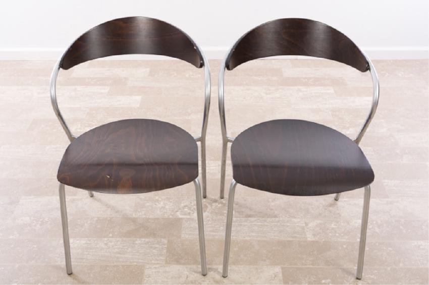 Pair of satin silver metal framed chairs having bentwood seats and backs with dark chocolate finish veneer; measure approximately 31" high, 21-1/2" wide with a seat depth of 17-1/4" and seat height of 17", each.