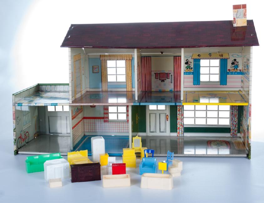 Vintage 1950s Marx Two Storey Colonial tin litho dollhouse, with original plastic toys, approximately 18 pieces. Measures 16" in full height to top of chimney, with length of 24-1/4", & depth of 8". in overall good condition with minimal scratches, dents, or rust. All measurements are approximate.