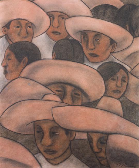 Diego Rivera (Mexico, 1886-1957) unframed chalk drawing depicting a crowd of men and women with the men wearing sombreros. Measures 19-3/4" in height and 15-7/8" in width. All measurements are approximate. No authentication paperwork accompanies this piece, however signature and style are consistent with those of known works by the artist and is signed to the lower right hand corner. Provenance: from the estate of a prominent European & Texas collector, known to not only to have collected quite an amazing assortment of notable art, but to have befriended a vast majority of the artists of whose work was acquired. For more information regarding this artist, please refer to lot #25 in this catalog. It is our recommendation that all pieces be examined in person either by perspective clients or a dealer the client has asked to give them a condition report. This is consistent with our terms of sale that all goods are sold as is and all sales are final.