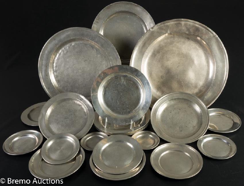 Lot of twenty (20) pewter plates to include: two unmarked measuring 4" in diameter; one unmarked measuring 5-1/4" in diameter; one unmarked measuring136-1/4" in diameter; one marked "WOG PORKINGTON" measuring 10-3/4" in diameter; three marked "MODERN ART PEWTER W.&5.B." with two measuring 7-1/8" in diameter and one measuring 6-1/2" in diameter; one marked "STIEFF PEWTER" measuring 6" in diameter; six marked "Williamsburg Restoration Stieff Pewter" with one measuring 5" in diameter, one measuring 5-1/2" in diameter, and four measuring 9" in diameter; one marked "Colonial Pewter W.S.N" measuring 6-1/2" in diameter; one marked "London" with other marks that are illegible measuring 14-3/4" in diameter; three marked "Crown and Rose Pewter London" with other illegible marks, one measuring 7" in diameter, one measuring 8-1/4" in diameter; and one measuring 8-1/2" in diameter. All measurements are approximate. In overall good condition consistent with age and use.