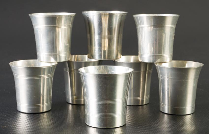 Eight pewter cups measuring 3" in height with a base diameter of 2". All measurements are approximate. Marked "Williamsburg Stieff Pewter" and "Williamsburg Restoration" with varying serial numbers to the bottoms. In overall good condition.