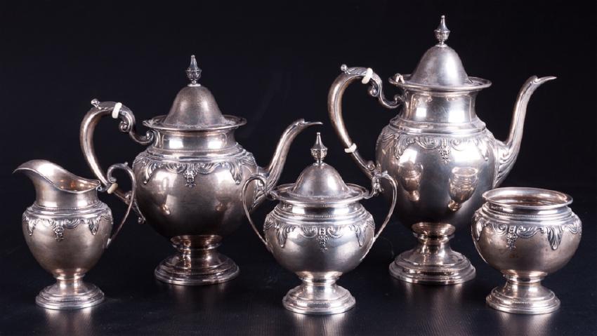 Antique sterling silver coffee and tea service by Wallace in the "Stradivari" pattern number 6530. The set includes a coffeepot (11-1/2" tall, 24 ozt); tea pot (10" tall, 16 ozt); sugar bowl with cover (7" tall, 10.47 ozt); creamer (6" tall, 7.99 ozt) and open waste bowl (4-1/2" tall, 6.95 ozt). No monograms. All marked "Stradivari by Wallace Sterling 6350" to the bottom. The set weighs 65.41 total troy ounces. All measurements are approximate. In overall good condition with age appropriate patina.