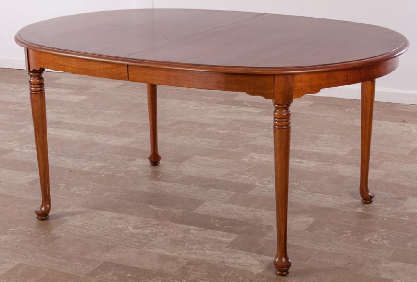 Davis Cabinet Company burnished cherry dining table with two leaves; measures approximately 30" high, 44" wide, 63-1/2" in length, each leaf 16". Marked to underside of table with paper label.