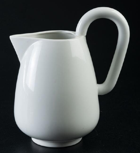 White glazed ceramic pitcher with handle; measures approximately 9-1/2” high and 8-1/4” from spout to handle. Marked to the bottom.