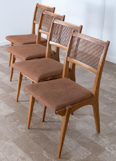 Set of four (4) side or dining hairs designed by John van Koert for Drexel’s "Profile" series with upholstered seats; measure approximately 34-1/2" high, 20" wide with a seat depth of 17-1/2" and seat height of 19”. Marked “by Drexel” to bottom.