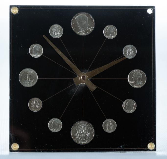 Hammacher Schlemmer 1964 Last United States Silver Coinage clock model no. 72 black; measures approximately 7-5/8” square. Has not been tested.